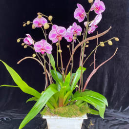 Price: $185.00 Phalaenopsis pink/spots design with a bromeliad and Natraj branches in wooden pot. Product Tags: Same-day Delivery