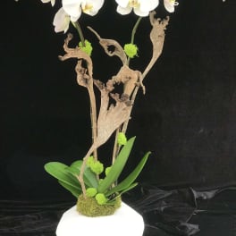Price: $175.00 Phalaenopsis pink/spots design with mini Phals. in wooden pot. Product Tags: Same-day Delivery