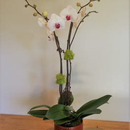 Price: $175.00 Phalaenopsis pink/spots design with mini Phals. in wooden pot. Product Tags: Same-day Delivery