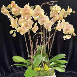 Price: $175.00 Phalaenopsis pink/spots design with mini Phals. in wooden pot. Product Tags: Same-day Delivery
