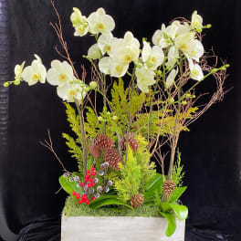 Price: $295.00 White phalaenopsis arrangement with holiday green and poinsettia. Product Tags: Same-day Delivery